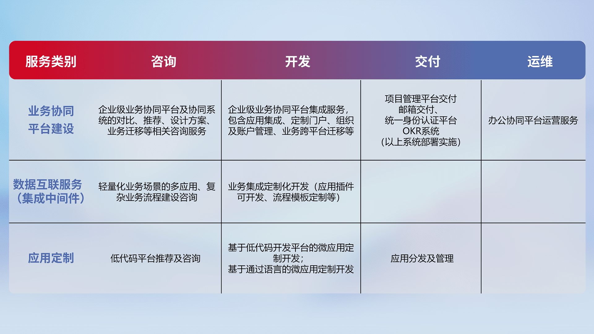 针对钉钉、、、企微、、、、IDaas等平台级产品提供产品的规划、、、、方案、、、交付、、、定制化开发等服务,,实现如统一协同办公、、、、智能客户服务、、、、混合会议管理、、智能数据查询、、、、等业务场景,,实现数字化转型。。。