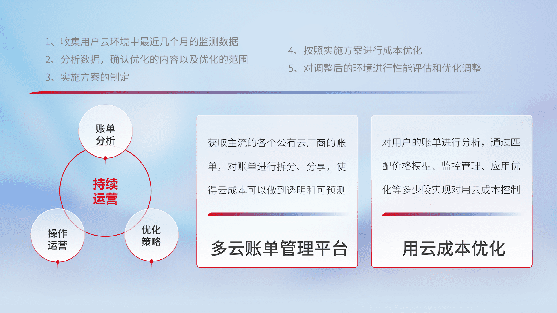 通过多云纳管,,,,以统一的资源数据模型把客户的云资源进行抽象和封装,,进而实现对多云资源的统一操作,,保障云资源管理的可靠性、、、、稳定性与可用性。。。。量身定制化运维内容,,,配置、、、开发运维、、、补丁管理、、备份、、、监控、、、、认证和访问管理、、、、审计和日常巡检等,,,保障在用云过程中的可靠度,,稳定度以及高可用率。。
